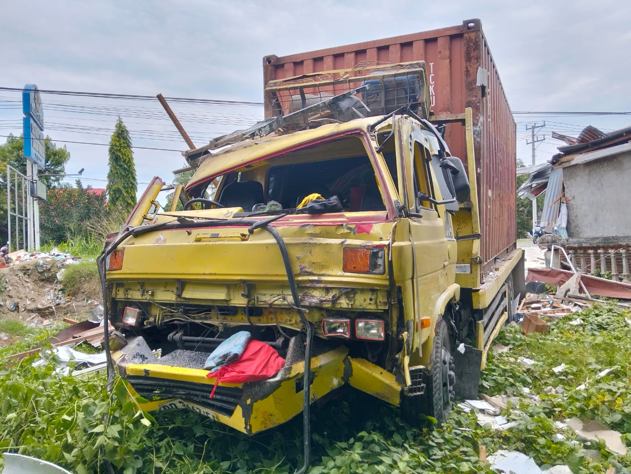 Benturan keras dari truk kontainer menyebabkan bagian depan kendaraan rusak parah. Apotik milik warga dan kanopi rumah hancur akibat tabrakan. Pemilik rumah, Hj Bahiyah, yang berada di dalam saat kejadian, mengaku mendengar suara dentuman keras seperti gempa bumi. Ia segera keluar rumah dan mendapati apotiknya telah porak poranda.